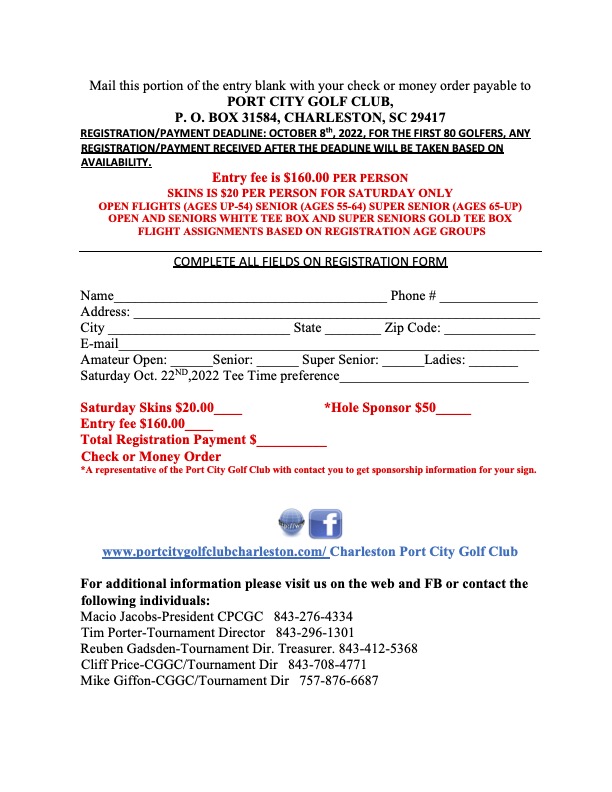 Registration check- in will begin at the Municipal Golf Course, 2110 Maybank Hwy, Charleston, South Carolina 29412 on Saturday 22rdfrom 7:30am to 9:30am. You may contact the tournament director by calling, 1-843-296-1301 for your scheduled tee times.